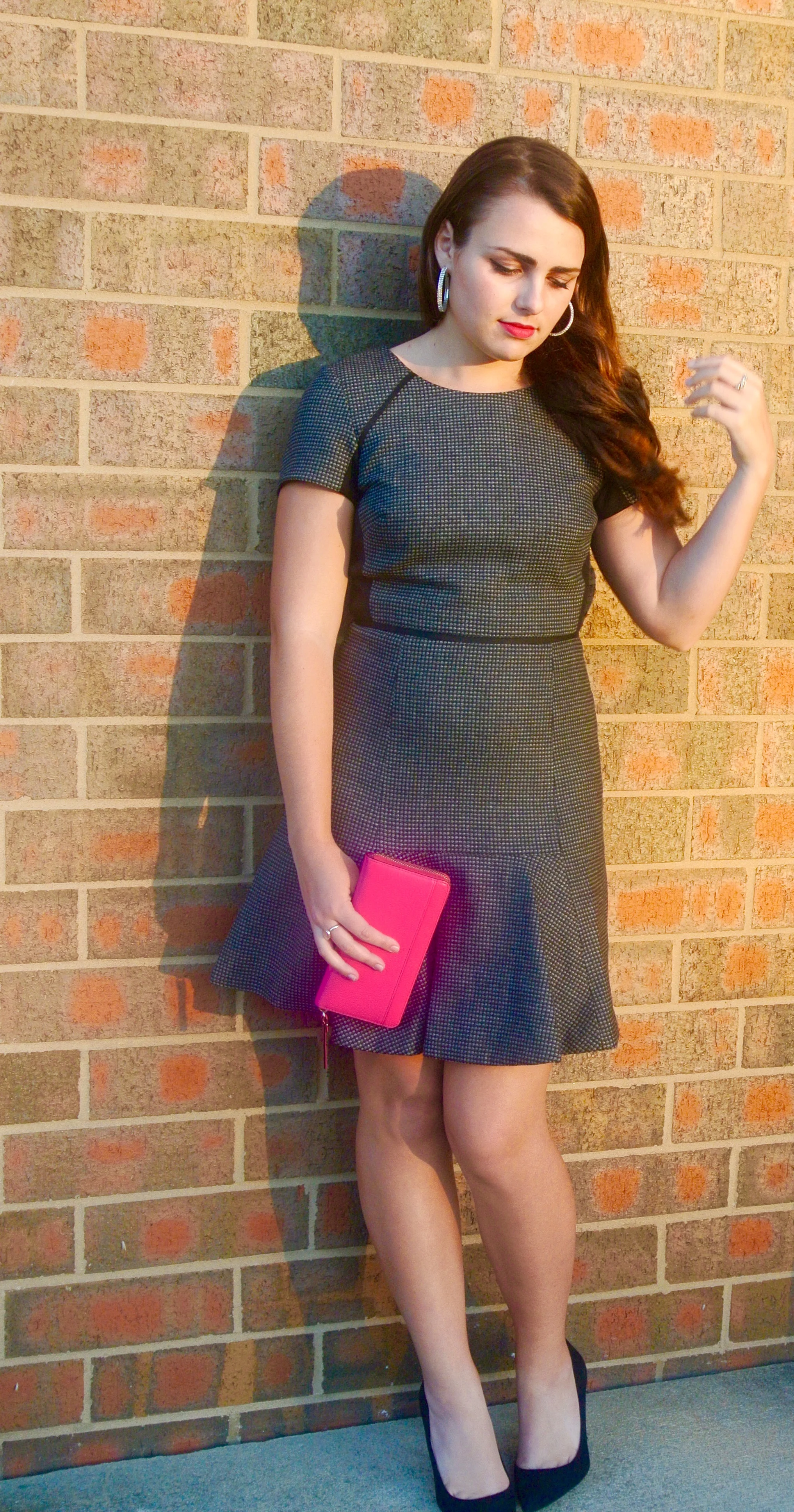 For shoes, I always have my go-to classic pumps from J. Crew to go perfectly with the dress. If it's a little cold that day, simple black tights would also be a great match for the look.