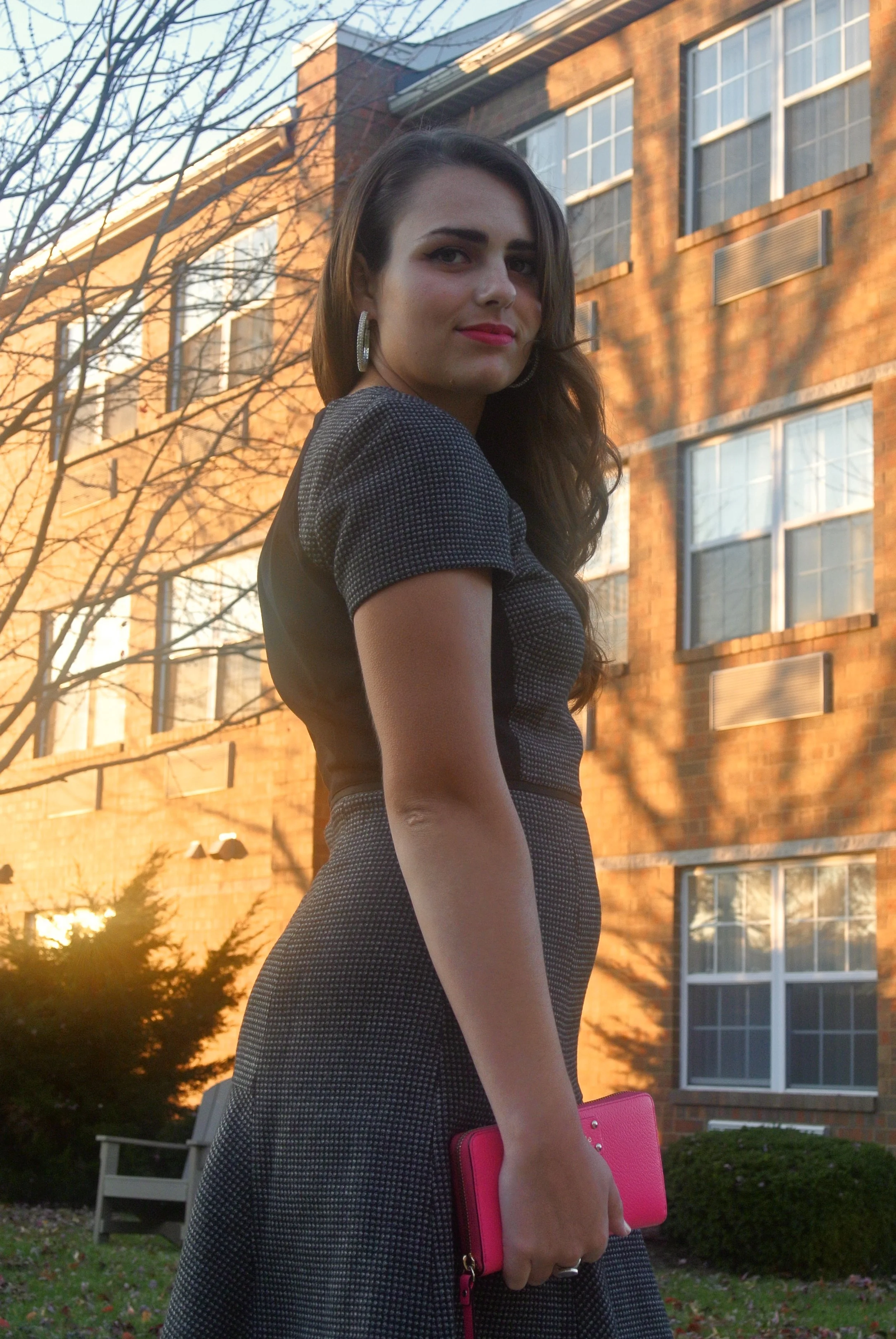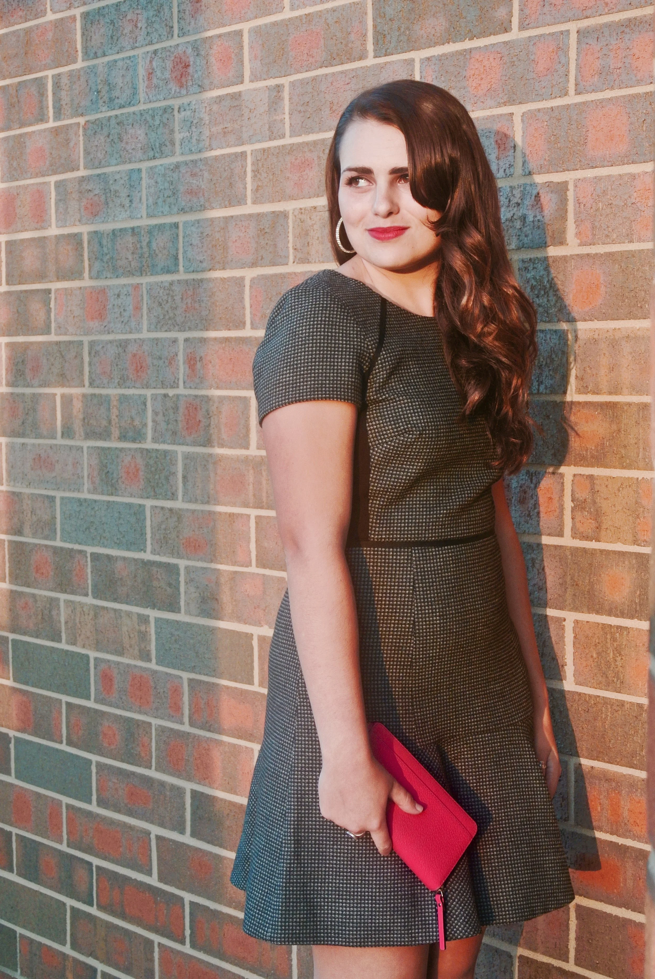 I got this dress from J. Crew, and it was originally around a hundred dollars. Luckily, it was on sale when I bought it and it was eighty dollars. Still expensive, but totally worth it! It's a flutter dress, with a gray-colored ponte knit material, grosgrain ribbon details, and a flirty skirt to bring out a feminine look that's perfect for a holiday party. I also love the plain black back of the top part!