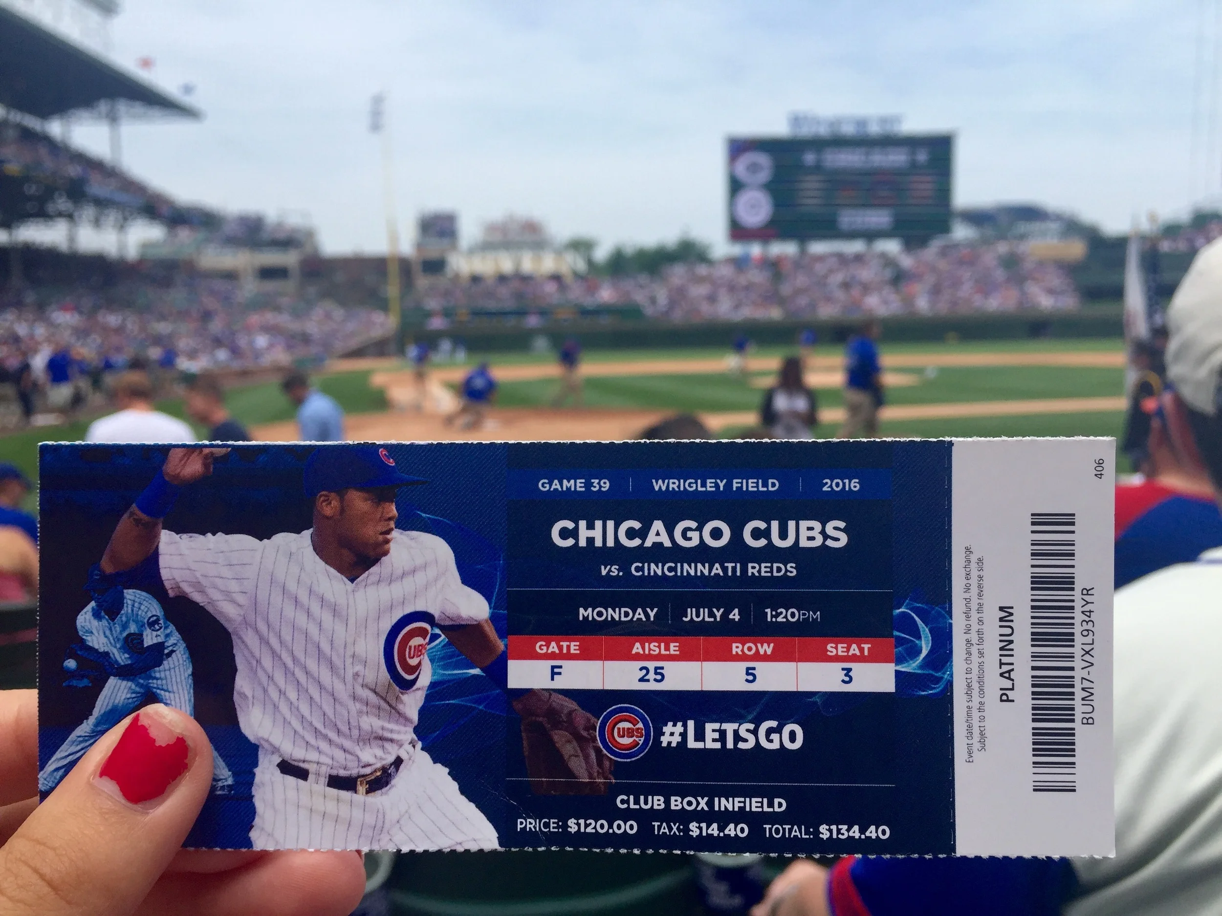 For the most patriotic day of the year, we got four tickets to a super awesome Cubs vs. Cincinnati Reds game in Wrigley Field. Despite being from Ohio, we wanted the Cubs to win! If they were playing against the Cleveland Indians, however, that would be a bit of a complicated decision.